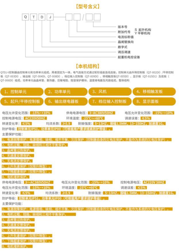 QTDJ-I型交流繞線電機調(diào)壓調(diào)速控制器是根據(jù)起重機運行特點而開發(fā)的專業(yè)調(diào)速產(chǎn)品,該產(chǎn)品在QTDJ控制器的基礎上開發(fā),屬我公司第二代調(diào)速產(chǎn)品,具有完全獨立的自主知識產(chǎn)權。新一代的QTDJ-I控制器采用了先進的軟硬件技術,主要技術指標達到國際先進水平。主令信號(220V)直接輸入,控制器內(nèi)部光電轉換,輸出以內(nèi)部晶閘管換向代替外部接觸器換向。這二項改進不僅簡化外部電路設計,而且提高了系統(tǒng)應用的可靠性。QTDJ-I控制器與前一代產(chǎn)品相比,控制性能更為優(yōu)越,而且降低了系統(tǒng)應用的造價,特別適合用于重級工作制且處于惡劣環(huán)境中的起重機的驅動和控制。